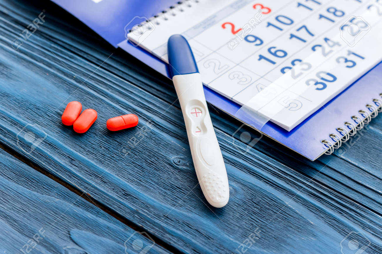 Positive Pregnancy Test With Calendar And Pills On Dark Wooden